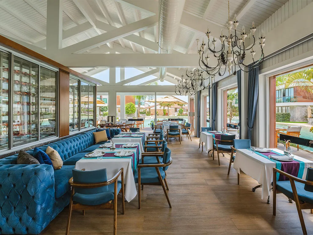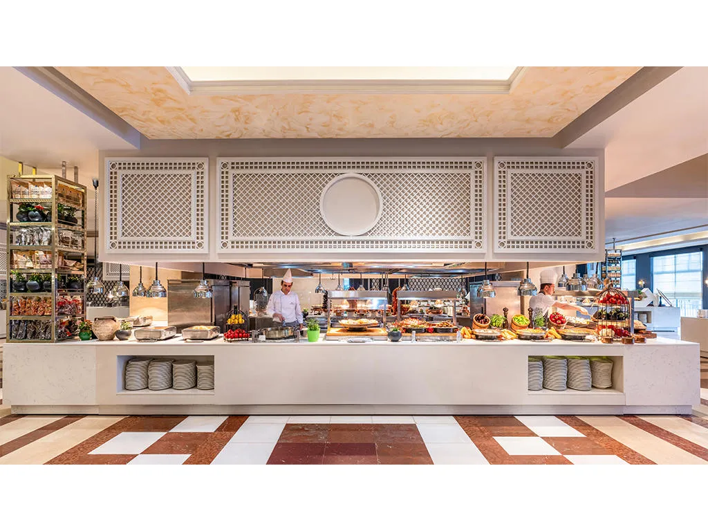 All inclusive & All exclusive – hrana 24 sata usluga hrana i piće, Turquoise glavni restoran sa otvorenim švedskim stolom za doručak, kasni doručak, seoski doručak (uz rezervaciju), branč, ručak, ponoćni bife, alkoholna i bezalkoholna pića svih domaćih i originalnih brendova, sok od svježeg voća za doručak, dijetalni kutak, veganski kutak i kutak za detoksikaciju u glavnom restoranu, kutak bez glutena u The Dem Cafe-u, usluga sladoleda, dječiji restoran u Rixy Kids Clubu. Nije uključeno: Specijalni uvozni šampanjci, specijalna uvozna vina, nargila, room service, A’la Carte restorani uz doplatu i rezervaciju unaprijed.