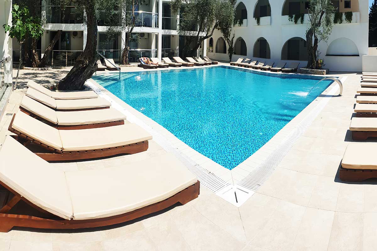 Otvoreni i zatvoreni bazen (ležaljke i suncobrani uključeni u cijenu), okruženi drvećem masline; sauna, parno kupatilo, jacuzzi, masaže; glavni restoran na 2 nivoa, 4 bara (vanjska i unutarnja); mini klub, dječije igralište; zabavni programi u ljetnom periodu.